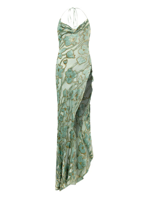 sage green floral pattern cowl neck asymmetrical hemline rear tie-fastening