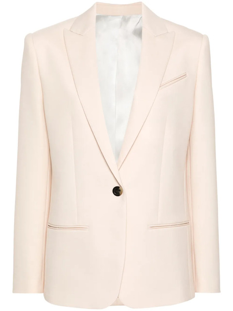 cream white twill weave notched lapels shoulder pads long sleeves dart detailing chest welt pocket two side welt pockets full lining straight hem front button fastening