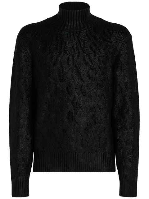 black cotton blend chunky knit knitted construction coated finish high neck ribbed cuffs and hem