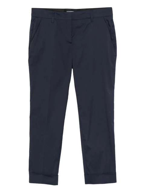 navy blue cuffed hem belt loops side pockets back welt pockets concealed front fastening