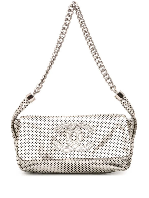 perforated leather body chain link shoulder strap front flap with magnetic snap closure interior zip and slip pockets silver Serial Number: 12185096 This item has no inclusions. Condition: GOOD. This previously owned and used item is in good condition with minimal signs of use. This may include fading of material or plating and scratches. Please refer to the photos on this product page for a detailed view of the item, including any damages declared.