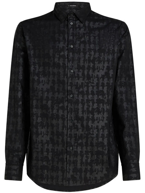black organic cotton all-over logo print logo tag classic collar front button placket long sleeves buttoned cuffs curved hem