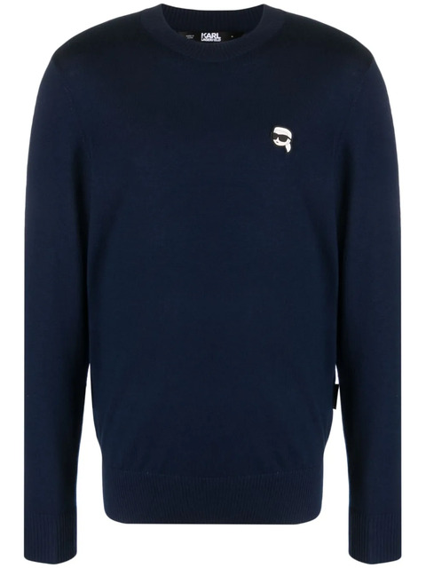 navy blue wool logo patch at the chest ribbed trim crew neck long sleeves straight hem