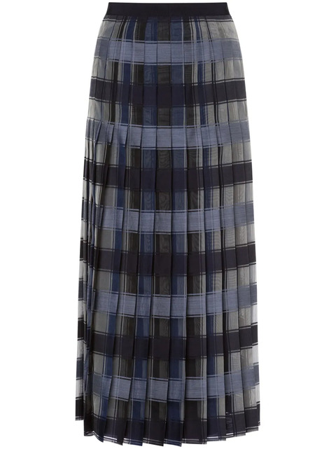 blue virgin wool-silk blend tonal design check pattern fully pleated high-waisted concealed side zip fastening two side inset pockets A-line straight hem