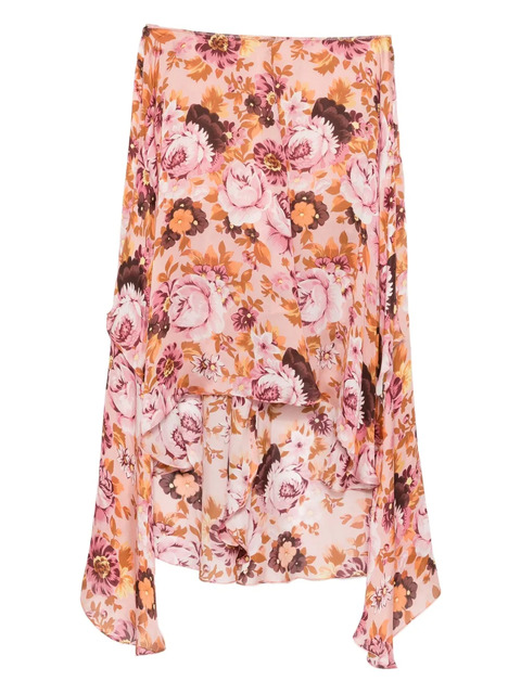 pink floral print ruffled detailing asymmetric hem layered design silk