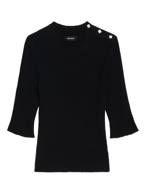 black ribbed knit embellishment at the shoulder round neck three-quarter sleeves