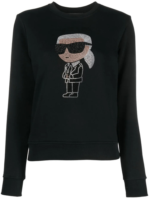 jet black organic cotton blend knitted construction signature Ikonik Karl motif rhinestone embellishment crew neck long sleeves fitted-cuff sleeves straight hem This item is made from at least 50% organic materials. Learn more about what makes a product Conscious on our Conscious Criteria page.