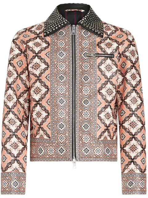 clay orange/black faux leather paisley print stud detailing front two-way zip fastening long sleeves zip-fastening chest pocket straight hem logo-jacquard lining