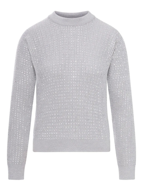 medium grey crystal embellishment ribbed knit round neck long sleeves ribbed cuffs and hem