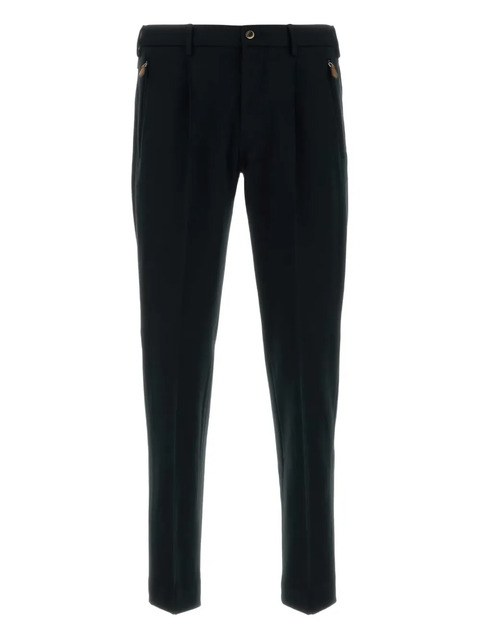 black front button and zip fastening rear flap pockets side zip-fastening pockets belt loops