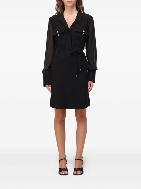 black semi-sheer sleeves pointed collar chest flap pockets front button fastening belted waist