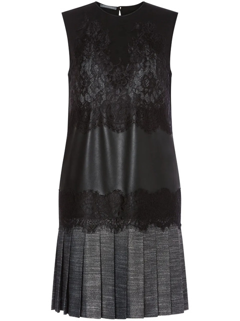 black leather crew neck sleeveless lace trim lace detailing pleated skirt single rear button fastening above-knee length