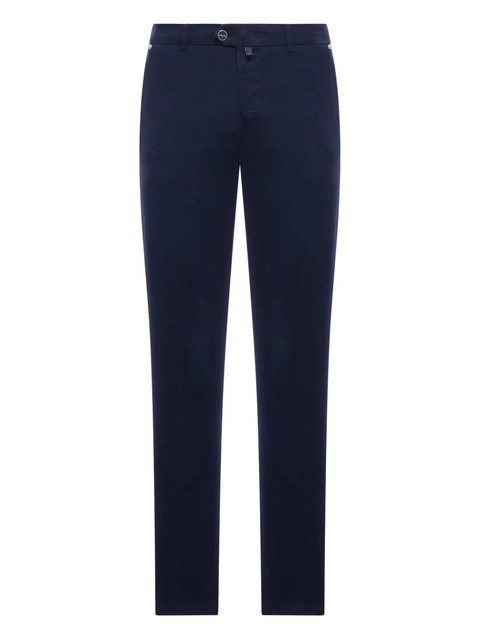 navy blue belt loops zip and button fastening side slip pockets two welt pockets at the rear logo patch at the rear