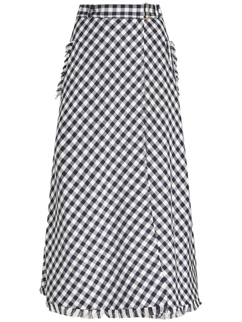 blue/white gingham check pattern fringed edge high-waisted wrap design buckle fastening two side welt pockets calf-length