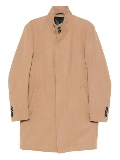 camel brown wool blend front button fastening long sleeves high neck buttoned cuffs