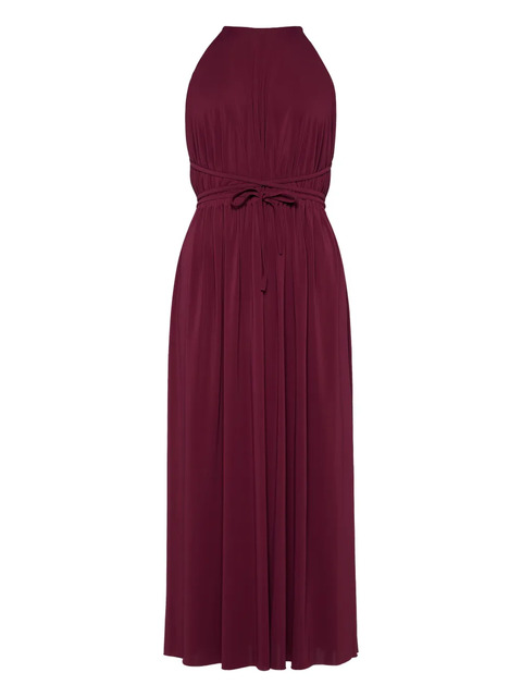 purple halterneck tie waist open back gathered skirt sleeveless