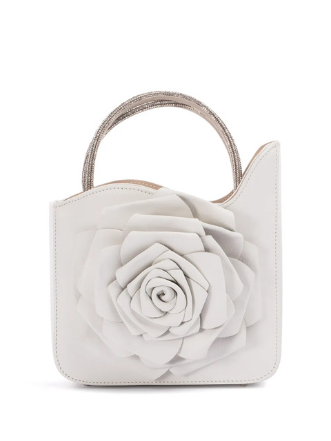 white nappa leather grained texture floral appliqué crystal embellishment circular top handles detachable shoulder strap main compartment silver-tone hardware open top