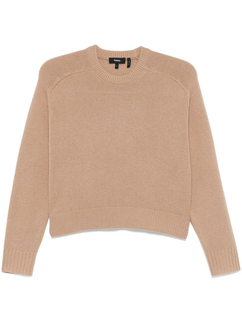 camel brown cashmere knitted construction crew neck ribbed trim long raglan sleeves straight hem cropped