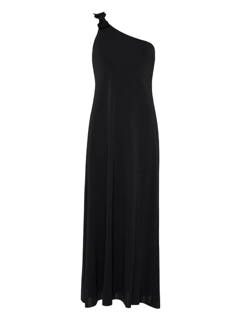 black one-shoulder neckline bow embellishment sleeveless maxi length straight hemline