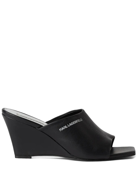 black leather logo print to the side square open toe branded leather insole slip-on style high wedge heel