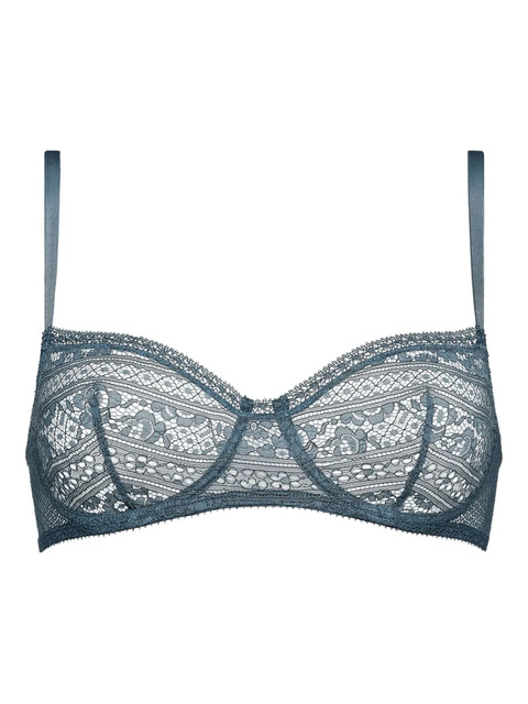 blue-grey demi-cup style adjustable straps hook-and-eye closure intricate lace pattern scalloped edges