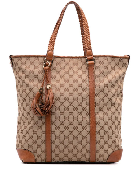 canvas body with leather trim braided leather handles open top with hook closure interior zip and slip pockets brown Serial Number: 257031 002404 Inclusions: dust bag, charm. Condition: GOOD. This previously owned and used item is in good condition with minimal signs of use. This may include fading of material or plating and scratches. Declared Damages: Exterior Back Feature(s) Minor Loose Stitching. Please refer to the photos on this product page for a detailed view of the item, including any damages declared.
