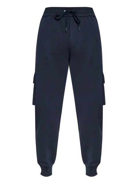 navy blue drawstring fastening side cargo pockets back patch pockets logo plaque ribbed cuffs