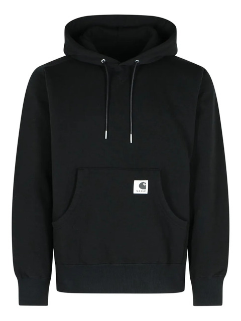 black drawstring hood kangaroo front pocket logo pach ribbed cuffs buttoned side slits