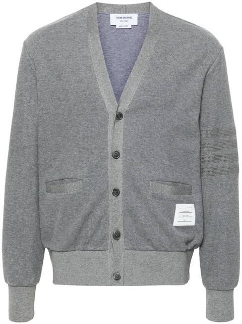 grey cotton knitted construction signature 4-Bar stripe signature grosgrain loop tab logo patch to the side ribbed trim V-neck front button fastening two side welt pockets straight hem