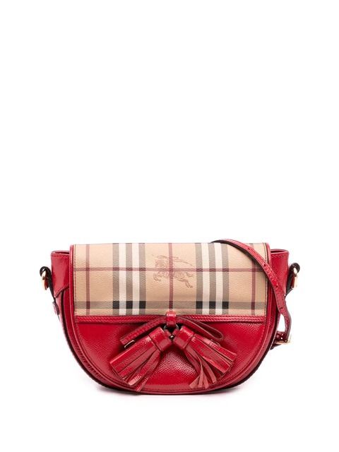 patent leather and haymarket check coated canvas body adjustable flat leather shoulder strap front flap with tassel details and magnetic snap closure interior slip pocket red This item has no inclusions. Condition: GOOD. This previously owned and used item is in good condition with minimal signs of use. This may include fading of material or plating and scratches. Please refer to the photos on this product page for a detailed view of the item, including any damages declared.