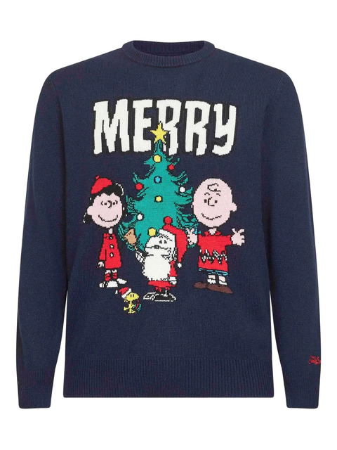 blue ribbed crewneck long sleeves st barth embroidery at wrist peanuts christmas artwork embroidery ribbed cuffs ribbed hem