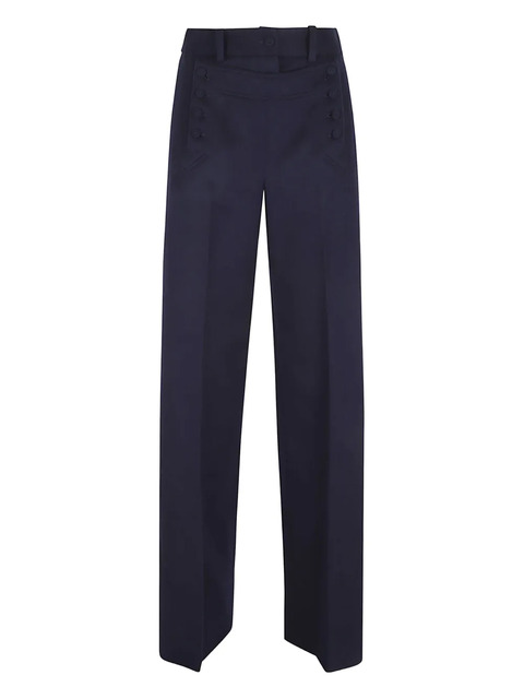 blue button detail side pockets belt loops tonal stitching wool