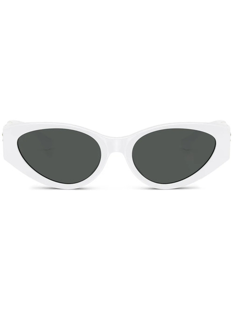 white cat-eye frame tinted lenses oversize arms Medusa Head motif curved tips nose pads These glasses come with a protective case.