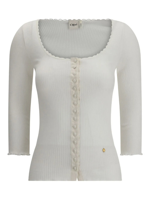 white ribbed knit scalloped trim round neck front button fastening three-quarter length sleeves