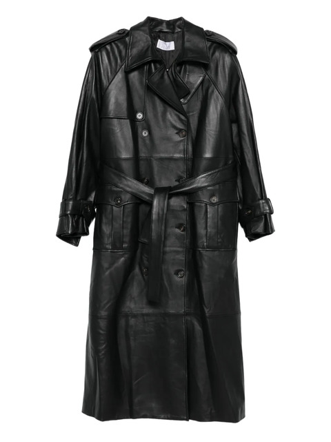 black double-breasted button fastening belted waist flap pockets shoulder epaulettes buttoned cuff straps