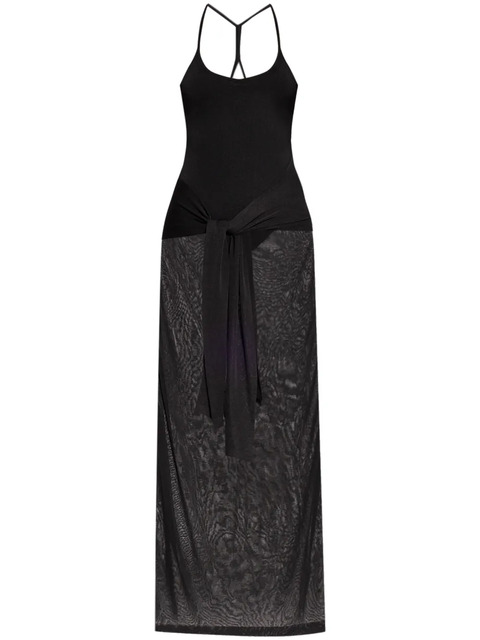 black semi-sheer construction appliqué logo scoop neck spaghetti straps rear criss-cross straps draped detailing long length