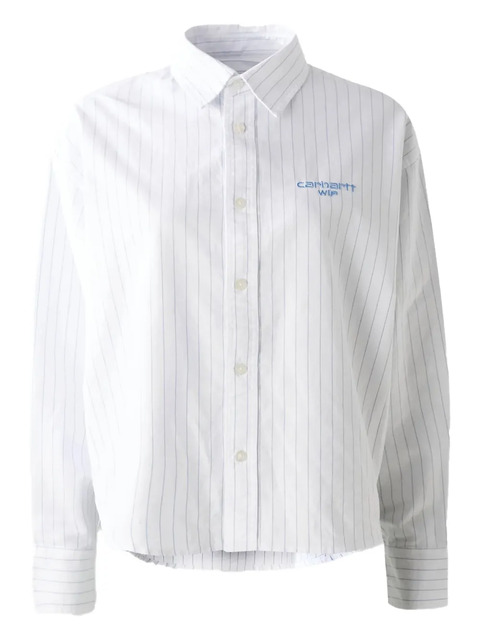 white vertical stripe pattern button fastening long sleeves buttoned cuffs embroidered logo at the chest