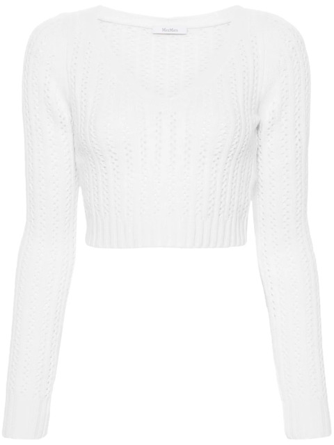 ivory white wool-cashmere blend knitted construction open knit V-neck long sleeves ribbed cuffs and hem straight hem cropped