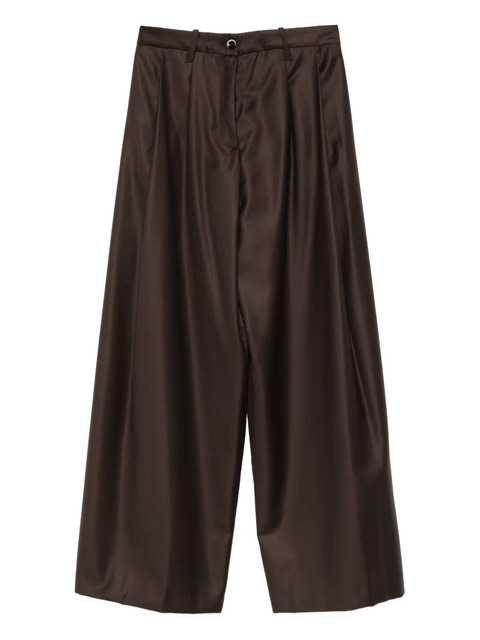 brown wool pleated detailing belt loops front button and zip fastening wide leg