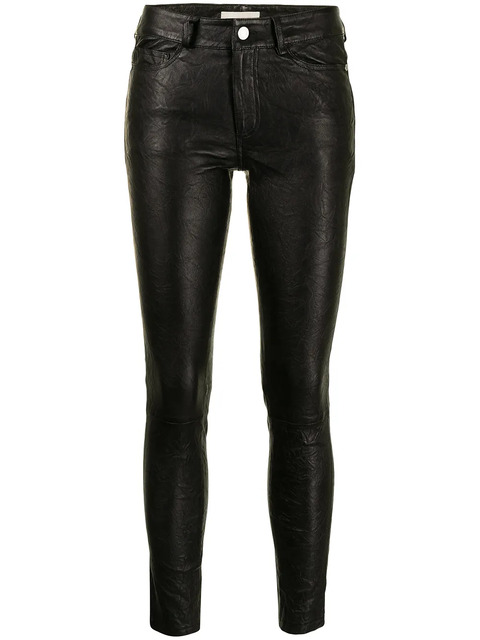 black lambskin cracked texture front button and zip fastening belt loops classic five pockets skinny cut