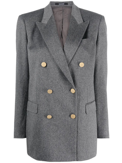ash grey cashmere gold-tone buttons peak lapels double-breasted button fastening long sleeves buttoned cuffs chest welt pocket two front flap pockets central rear vent straight hem full lining