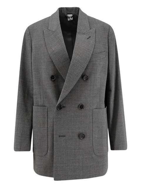 grey double-breasted button fastening peak lapels front patch pockets buttoned cuffs
