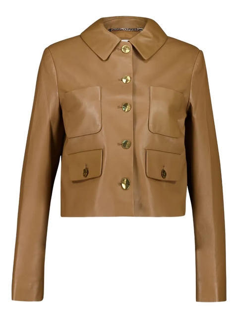 brown button fastening point collar chest pockets buttoned cuffs leather
