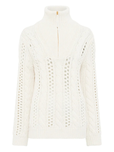 ivory cable knit mock neck half zip fastening open knit details long sleeves