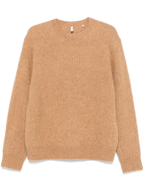 caramel brown knitted construction brushed effect crew neck ribbed trim long sleeves straight hem