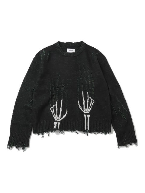 black distressed detailing skeleton hand motif round neck long sleeves ribbed hem