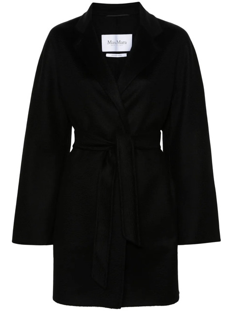 black cashmere notched lapels long sleeves detachable waist belt internal locker loop internal logo tag mid-length straight hem open front self-tie fastening