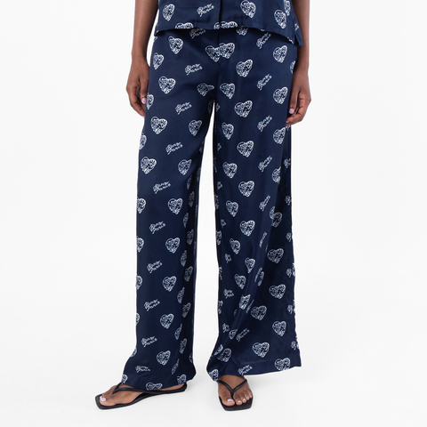 Kenzo Ladies Bottoms. Fashion category: Pants & Leggings. SKU: FE62PA0849O2.77. Color: Midnight Blue. Kenzo Jungle Heart Printed Pajama Pants. These pajama pants are crafted from lightweight, all-over printed viscose and feature the Kenzo Paris signature subtly integrated into the design. Designed for comfort and style, they include an elasticated waistband, two side pockets at the front, and jetted pockets at the back. Contrasted piping along the sides adds a refined touch to the relaxed silhouette. 100% Viscose. Made in Bulgaria.