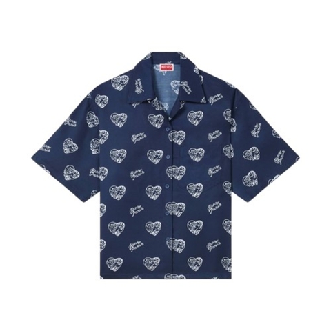 Kenzo Ladies Tops. Fashion category: Shirts & Blouses. SKU: FE62CH2579O2.77. Color: Midnight Blue. Kenzo Jungle Heart Hawaiian Shirt. The 'kenzo jungle heart' hawaiian shirt is made from lightweight viscose with an all-over print and features a pajama-style shirt collar, short sleeves, and piping details. it includes patch pockets and a subtle 'kenzo paris' signature woven into the print. 100% viscose. Made in Bulgaria.