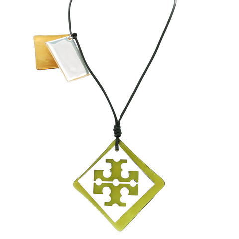 Tory Burch Ladies Necklaces. SKU: 157942-300. Color: Light Silver /Dark Green/Multi. Tory Burch Resin Logo Long Necklace. Suspended from a sleek black cord, the pendant showcases a square frame in a glossy olive-green finish, intricately cut with a symmetrical motif for an eye-catching touch. Accented with metallic rectangular charms in gold and silver tones, this piece blends contemporary style with artistic flair.